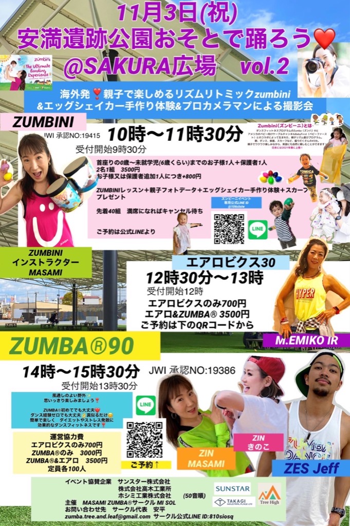 11月3日(祝)に大阪府高槻市の安満遺跡公園にてZUMBINI、ZUMBA、エアロビクスのイベントがあり